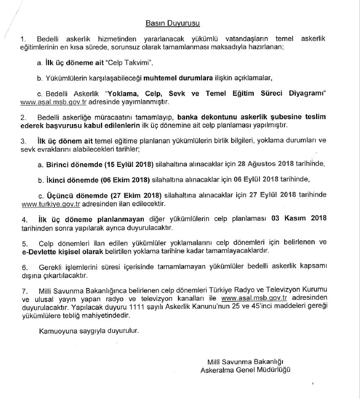 Bedelli Askerlik Hizmetine İlişkin Celp ve Sevk Duyurusu