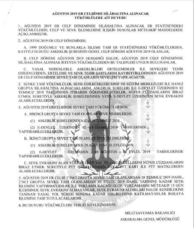 Ağustos 2019 er celbinde silah altına alınacak yükümlülere ait duyuru ekte sunulmaktadır.